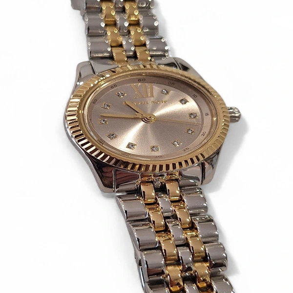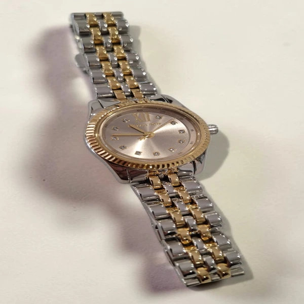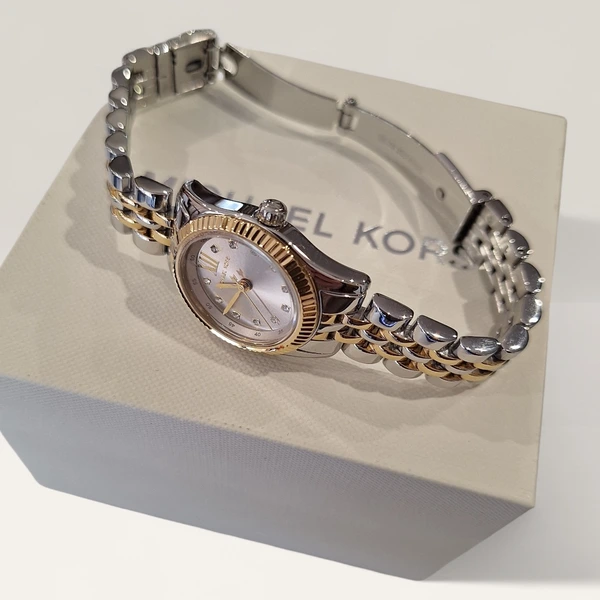 Ceasul din acest set are un design clasic și elegant, cu cadran luminos și detalii aurii, completat de o brățară metalică în două tonuri (argintiu și auriu). Acest ceas Michael Kors damă este potrivit pentru purtare zilnică, dar și pentru ocazii speciale, oferind un echilibru perfect între stil și funcționalitate.