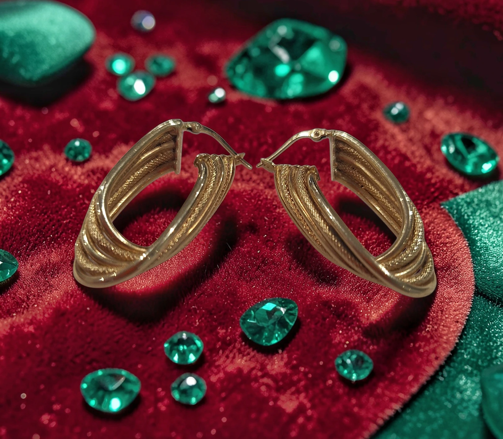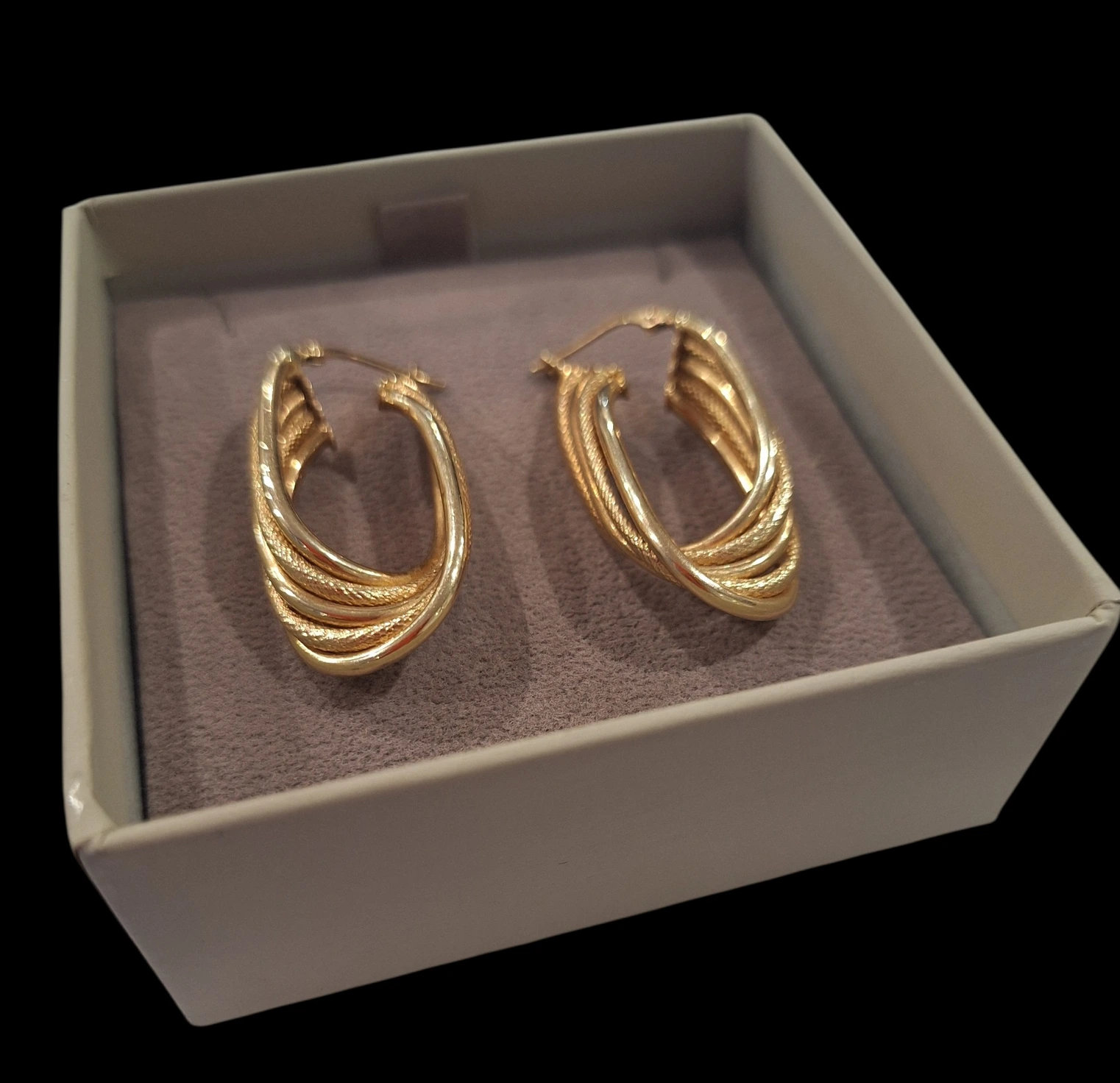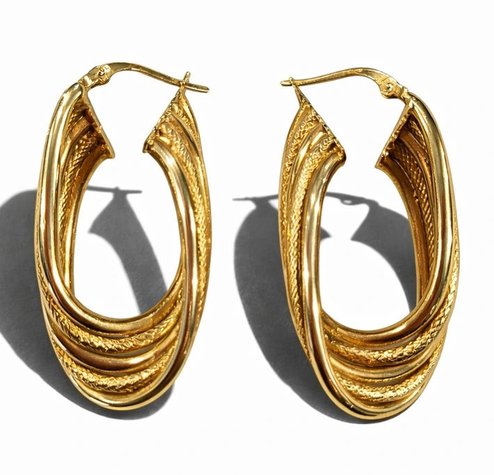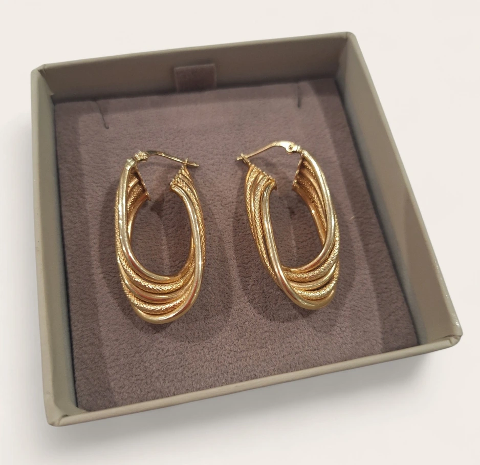 Cercei aur 14K tip creole, model elegant cu design texturat, greutate 5,72g. Bijuterii rafinate disponibile la M&S Pawn Shop – amanet Focșani.