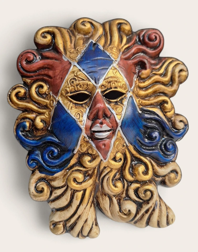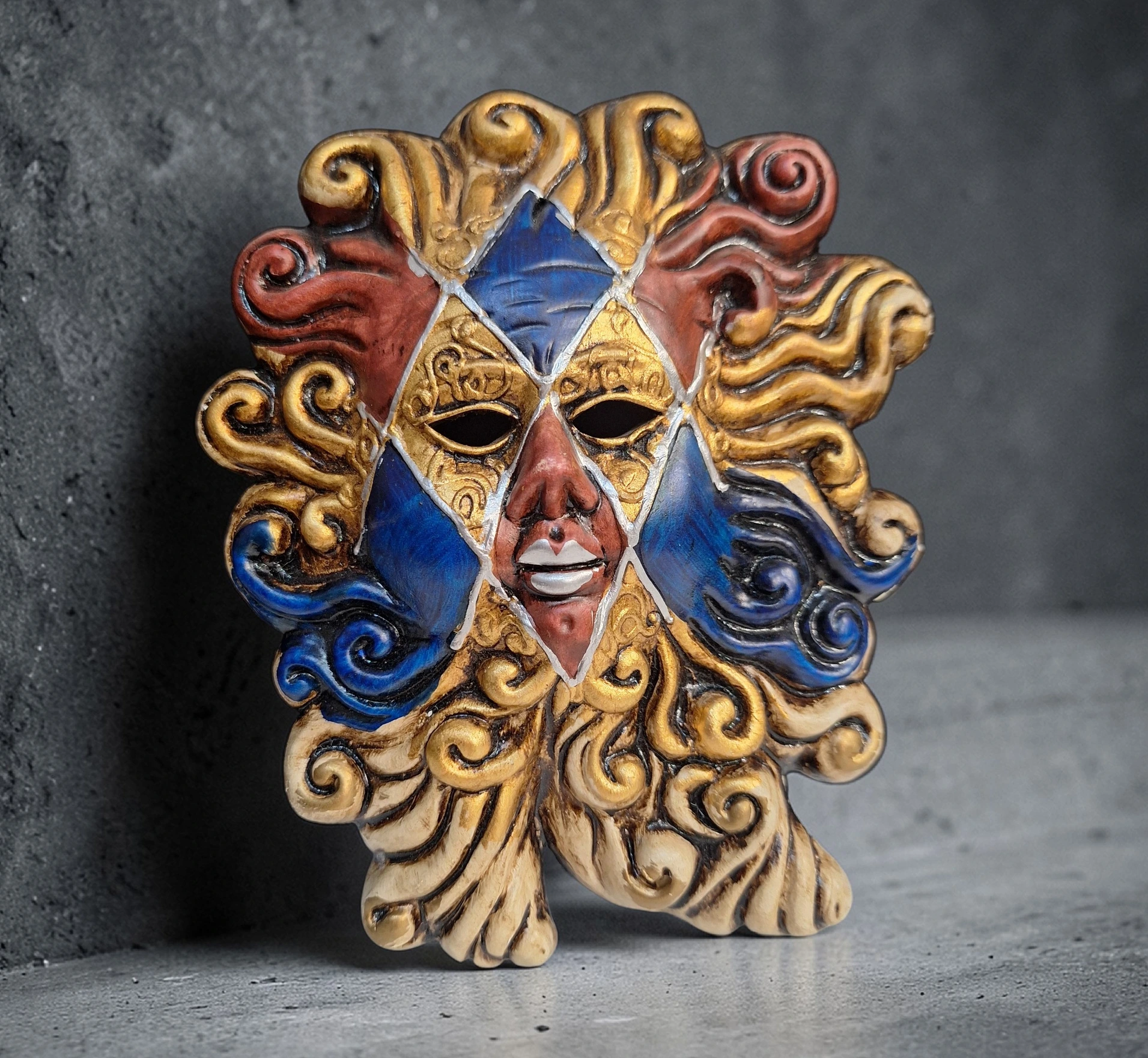 Mască decorativă inspirată din stilul clasic venețian, realizată în culori vibrante (albastru, roșu și auriu), cu detalii ornamentale bogate.