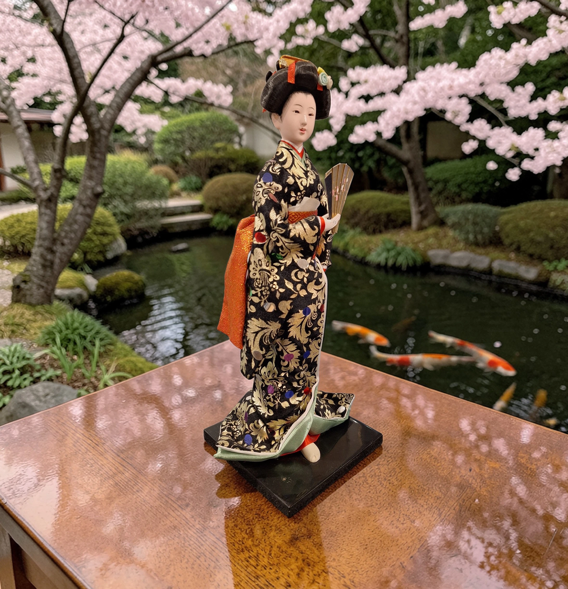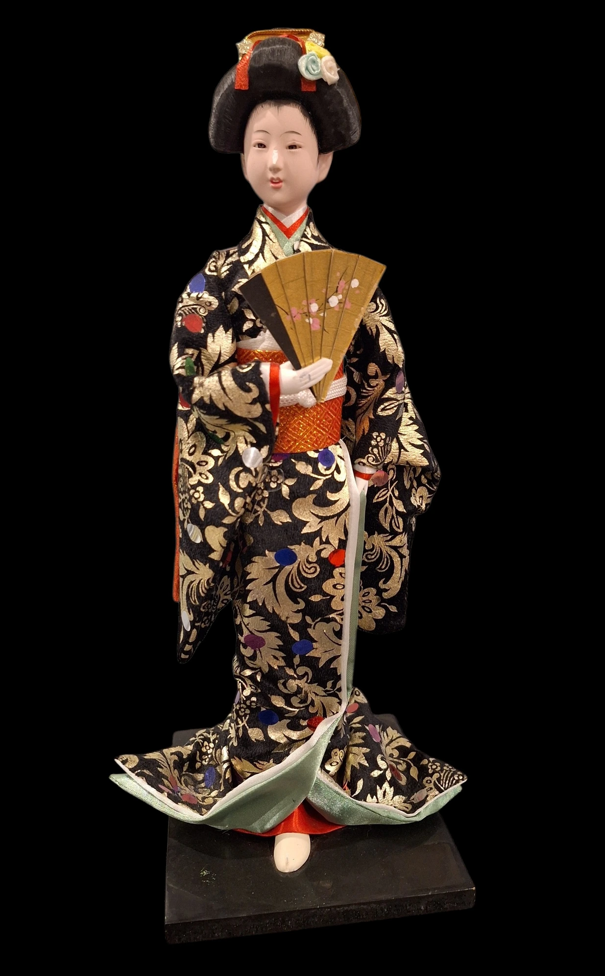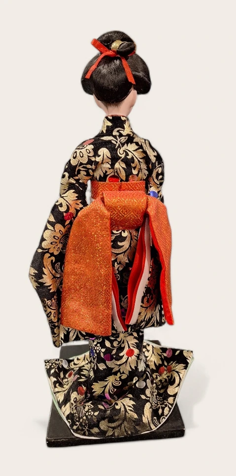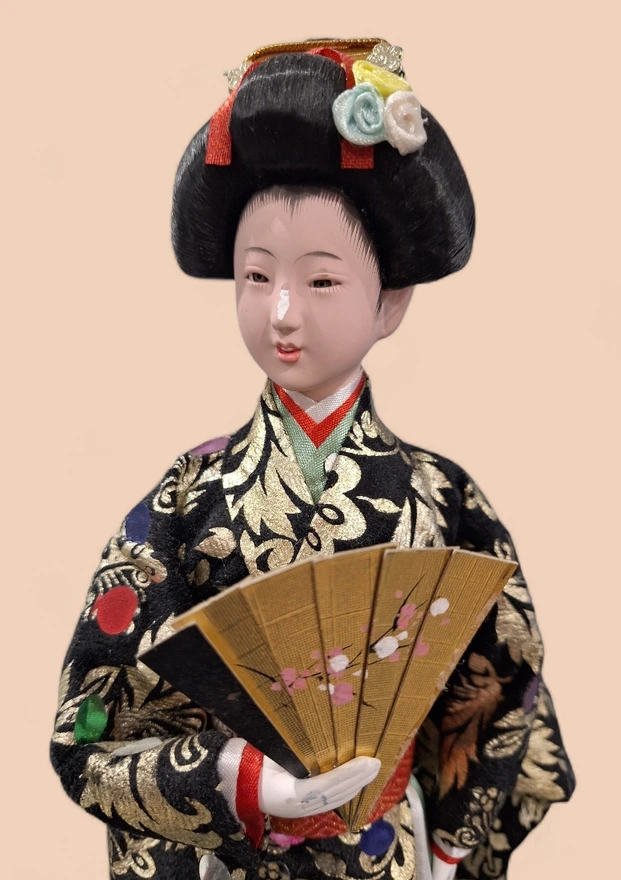 Figurina reprezintă o geisha în poziție grațioasă, ținând un evantai delicat, simbol al eleganței și artei japoneze. Kimono-ul este bogat decorat, cu modele florale detaliate și texturi textile fine, care oferă un aspect premium și autentic.